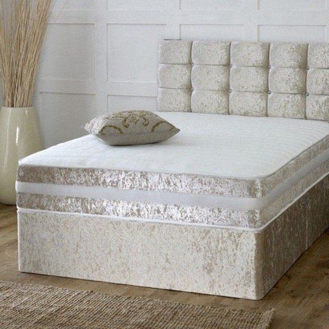 DIVAN BED FULL SET CRUSHED VELVET 24 INCH HEADBOARD ,MEMORY FOAM SPRUNG MATTRESS 10 INCH THICK ALL SIZES ARE STANDARD UK ,AVAILABLE IN CRUSHED VELVET SILVER,CHAMPAGNE,MINK GOLD BLACK, GREY PINK