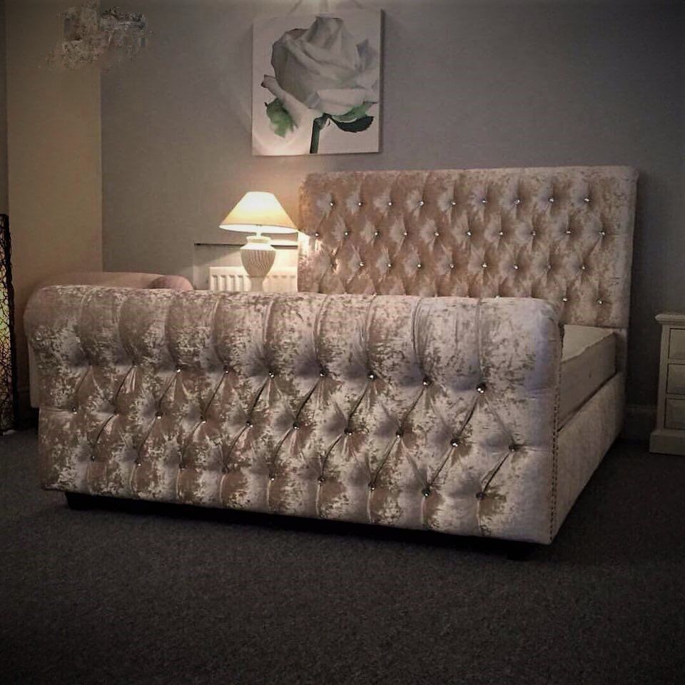 FULL SET CRUSHED VELVET 24 INCH HEADBOARD ,MEMORY FOAM SPRUNG MATTRESS 10 INCH THICK ALL SIZES ARE STANDARD UK ,AVAILABLE IN CRUSHED VELVET SILVER,CHAMPAGNE,MINK GOLD BLACK, GREY PINK